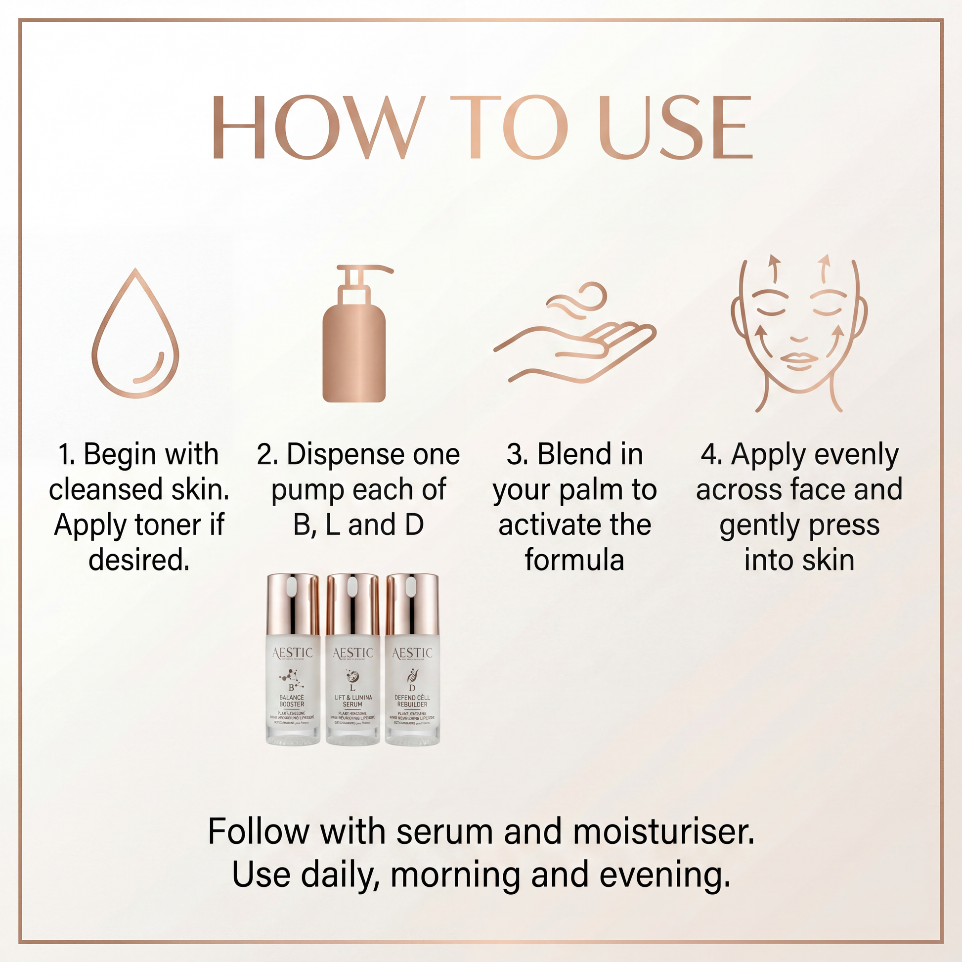 Mix one pump of each (B + L + D) in your palm and apply immediately after cleansing, , before your regular serums or creams.